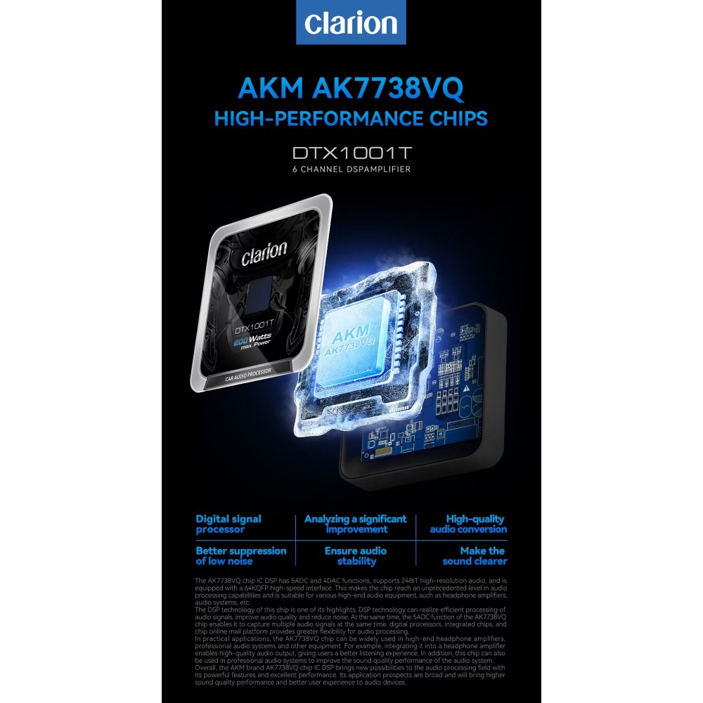 Clarion DTX1001T DSP Car Audio Processor features the high-performance AKM AK7738VQ chip, supporting 24-bit high-resolution audio and 64KQFP high-speed interface for superior sound reproduction and noise reduction.